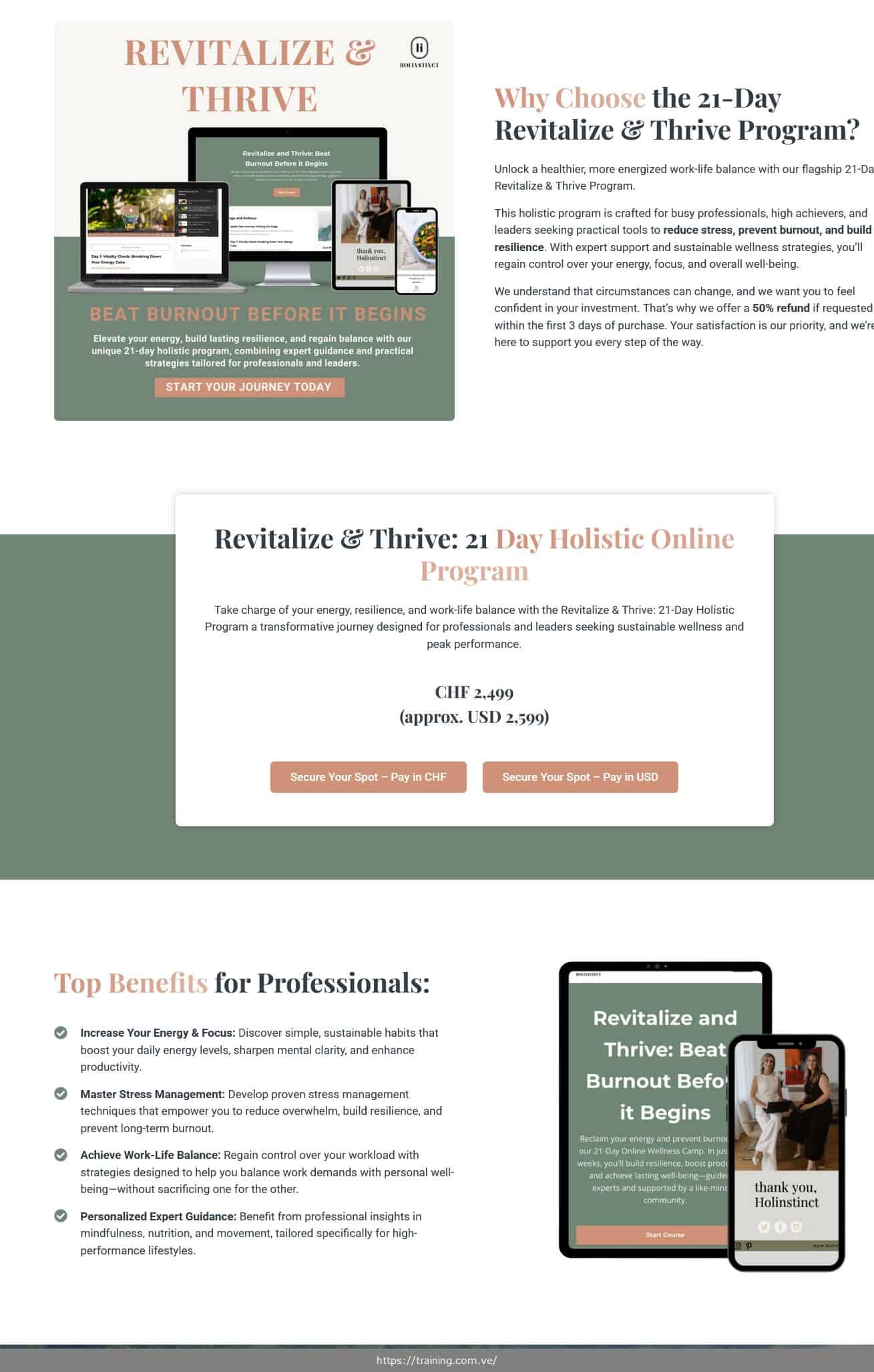 The 21-Day Revitalize & Thrive Program is a holistic online wellness course created by the Holinstinct team. It guides professionals and leaders through a structured 3-week journey to rebuild energy, manage stress, build resilience, and prevent burnout using an integrated approach of mindfulness, nutrition, and movement.