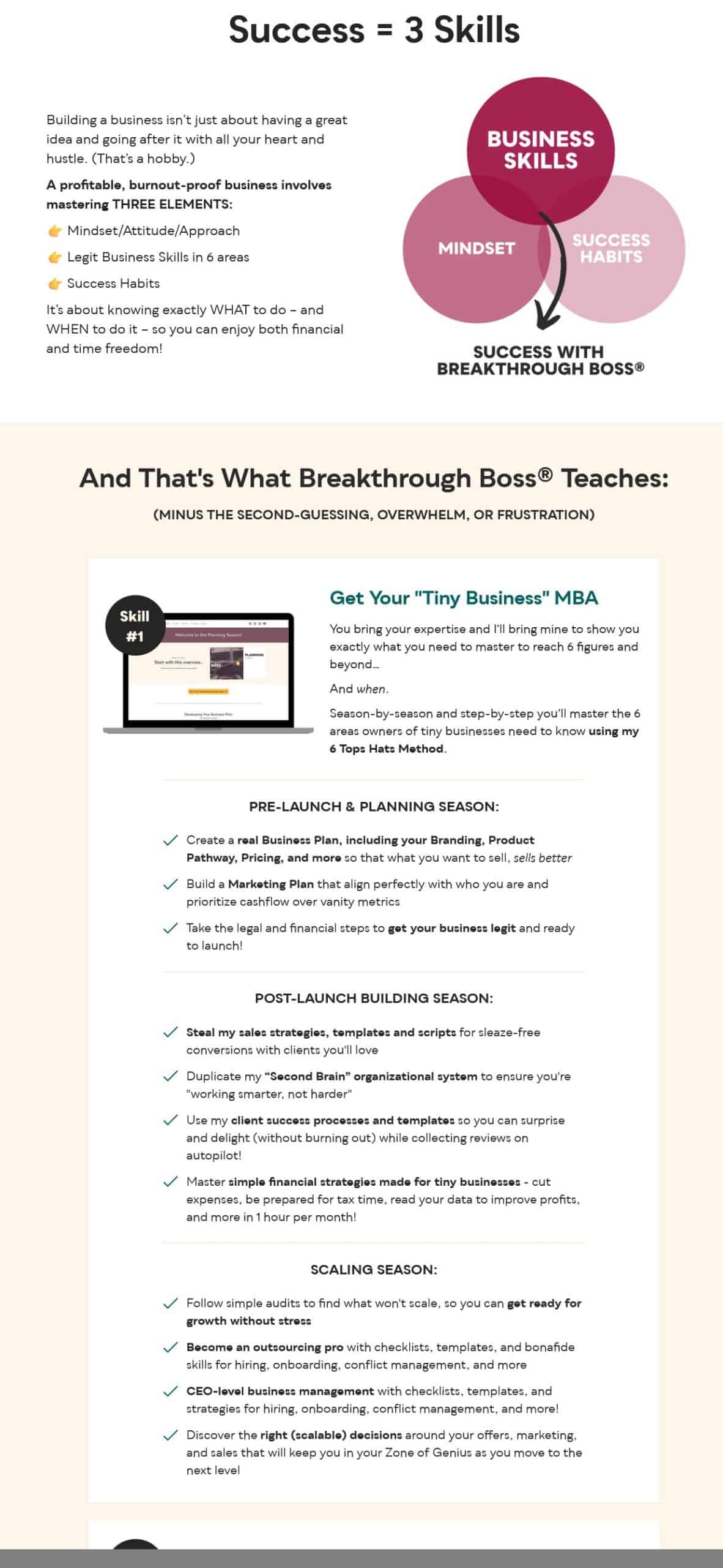 Breakthrough Boss® is a comprehensive self-paced business training program from Tara Wagner—an Accredited Small Business Consultant® and multi-7 figure business owner with over 25 years of entrepreneurial experience. This program teaches solopreneurs and micro-business owners how to build profitable, burnout-proof businesses using the proven 6 Top Hats Method and 3 Season Framework. Unlike courses that focus only on surface-level tactics, Breakthrough Boss® combines deep mindset coaching with practical business skills to help you master planning, branding, marketing, sales, systems, finances, and scaling—all while developing the success habits and CEO mindset required to reach 6 figures and beyond without sacrificing your health, family, or sanity.