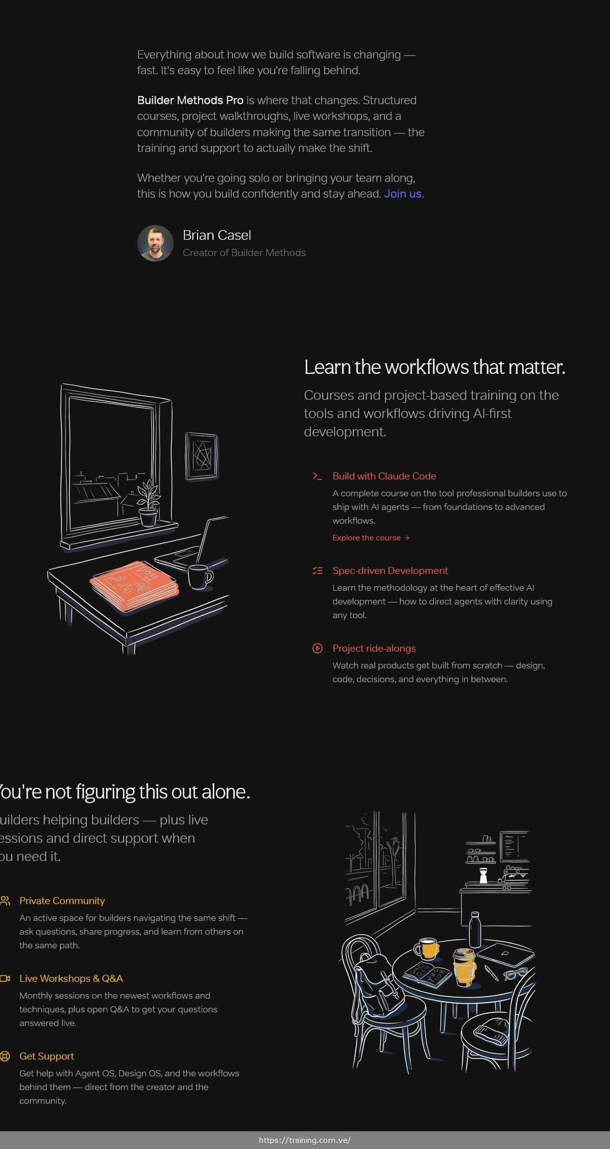 > Note: This download includes all recorded training content, video lessons, workshop recordings, PDFs, and reference materials from the Builder Methods Pro program. Live monthly workshops, private community access, ongoing new content releases, and direct support from Brian Casel are available exclusively through an active Builder Methods Pro membership at buildermethods.com.