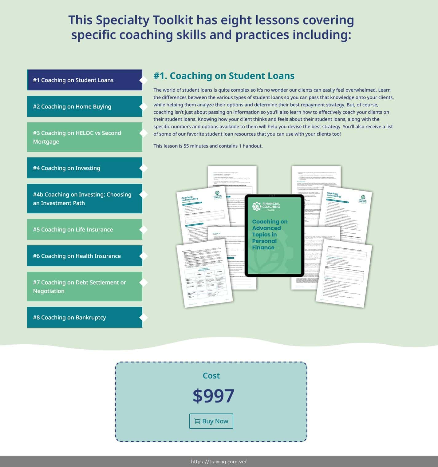 - The Specialist Coach Serving a Specific Niche — You work primarily with young professionals, families, or pre-retirees who routinely face advanced financial decisions like student loan strategy, home buying, or investment selection. You need deep, specialized coaching frameworks for these recurring topics your ideal clients encounter.