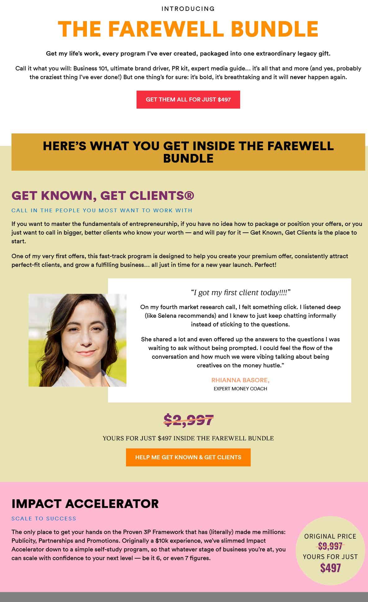 The Farewell Bundle is the complete collection of every program Selena Soo has ever created—packaged into one extraordinary legacy offer. From the publicity strategist who helped thousands of entrepreneurs go from “best-kept secret” to industry leader, this bundle includes her signature program Impacting Millions, the $10K Impact Accelerator mastermind (now available as self-study), her media contacts Rolodex with 700+ journalist names, and her brand new Rich Relationships Course based on her USA Today Top 10 bestselling book. After generating over $13 million in revenue through dozens of 6 and 7-figure launches, Selena is retiring these programs and making them available one final time at an unprecedented 96% discount.