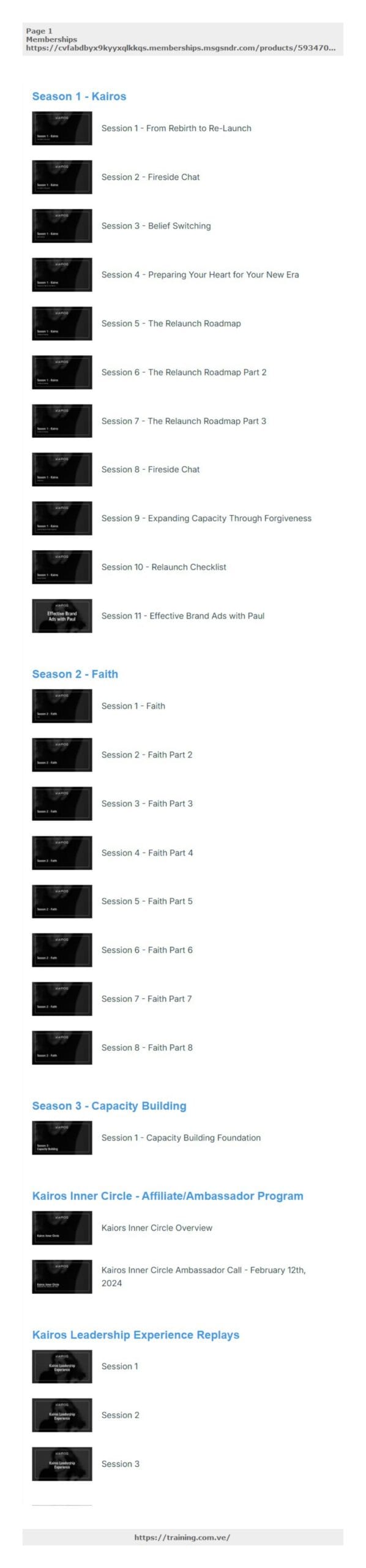 ✅ Season 1 – Kairos (11 videos, 12h 45m 47s): Complete video training on rebirth to relaunch, belief switching, preparing your heart for your new era, the relaunch roadmap (3-part series), expanding capacity through forgiveness, and effective brand advertising strategies.