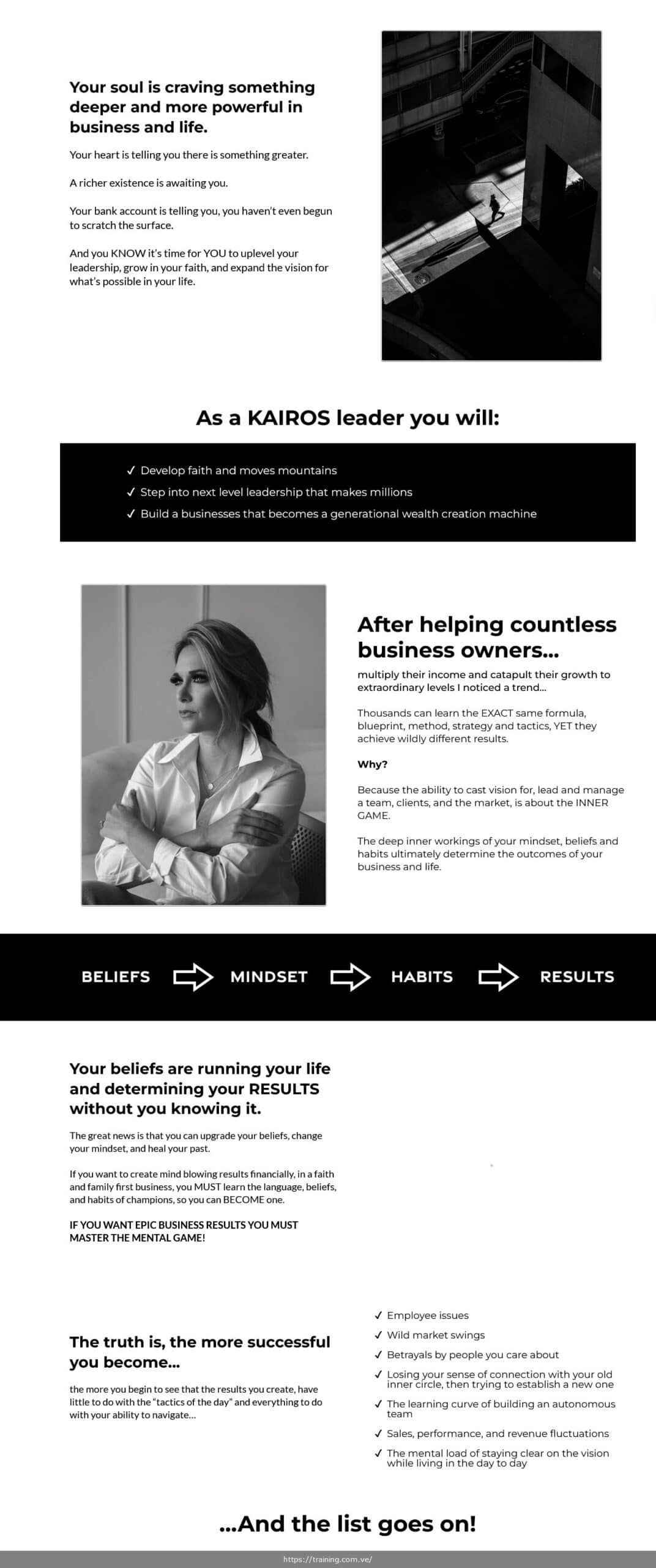 - The Entrepreneur Who Knows It's Time for Their Next Era — You feel the pull toward something bigger but can't articulate what it is. You know your current chapter is ending. The Kairos Leadership Experience training helps you unlock your new era, align with your next-level identity, and become the ultra-high performance leader required for where you're going.
