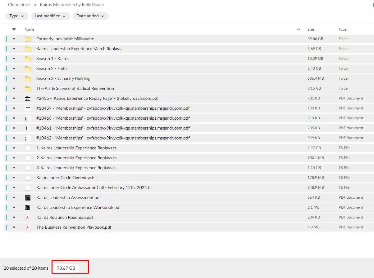 Kairos Mentorship includes 112 video lessons totaling 96h 54m 51s, 70 downloadable PDFs, and 27 documents, all contained in 73,67 GB of content. The program consists of 6 major components: Formerly Inevitable Millionaire (57 videos, 53h 36m 50s), Kairos Leadership Experience March Replays (10 videos, 9h 34m 13s), Season 1 – Kairos (11 videos, 12h 45m 47s), Season 2 – Faith (8 videos, 7h 55m 23s), Season 3 – Capacity Building (1 video, 58m 20s), and The Art & Science of Radical Reinvention (20 videos, 6h 26m 25s). All sessions include companion workbooks, session transcripts, SOPs, and implementation resources.