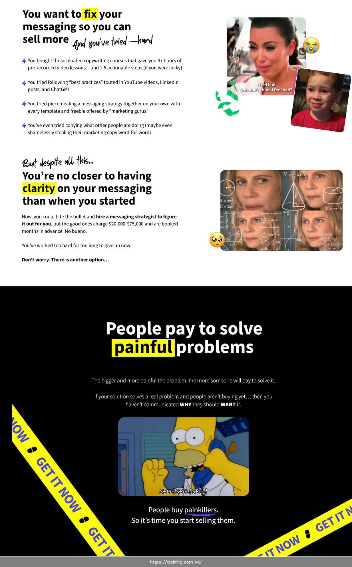 “My product has great features but no one understands why they need it” — Module 2's “Vitamins vs. PAINKILLERS” framework teaches you how to transform feature-focused messaging into pain-focused positioning that makes your product feel like an urgent necessity rather than a nice-to-have supplement.