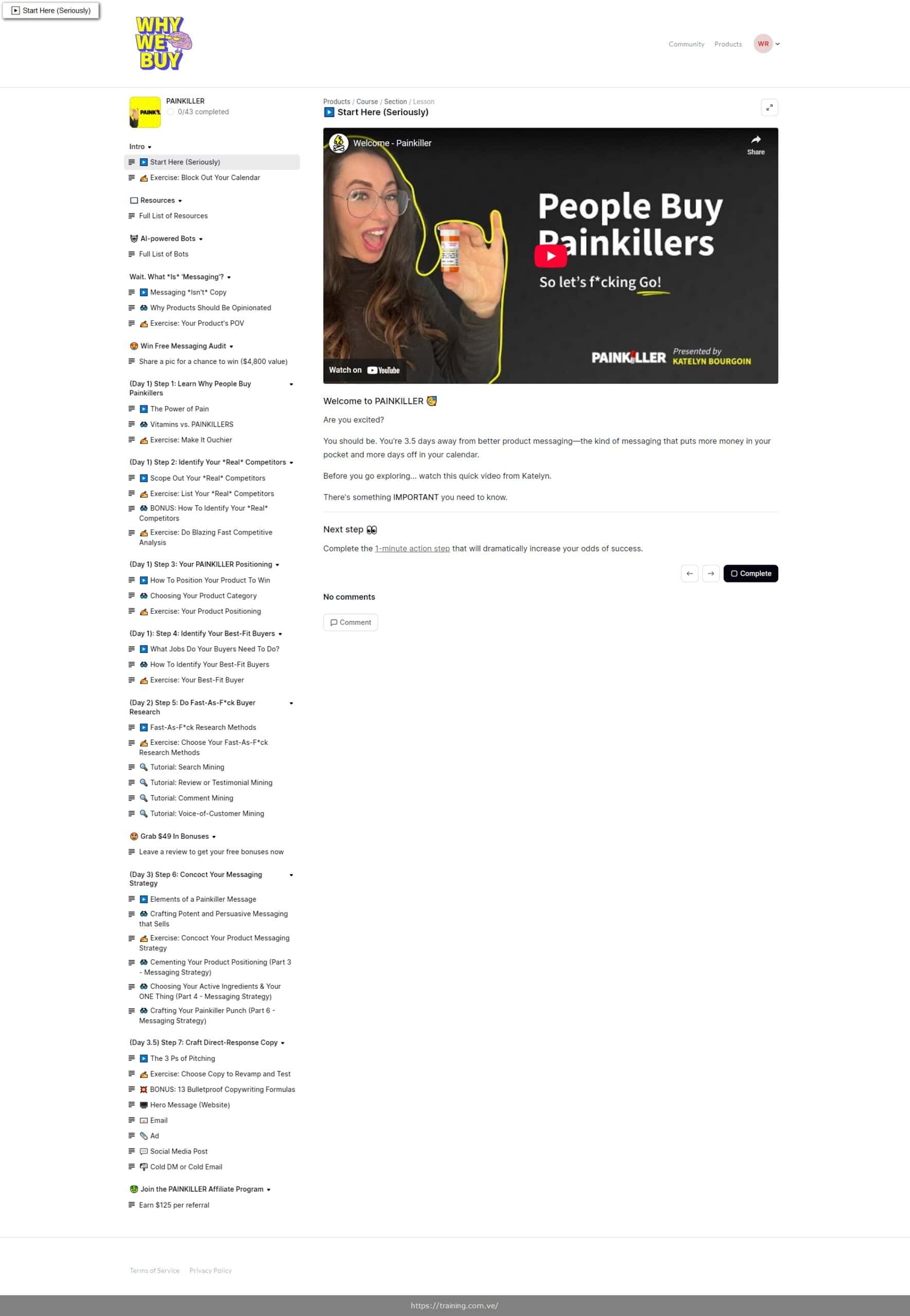 PAINKILLER is a comprehensive messaging and positioning system created by Katelyn Bourgoin, a 4X founder turned growth strategist who has been recognized as an “influential entrepreneur” by Forbes and teaches 280,000+ people buyer psychology through her Why We Buy newsletter. This fast-action program helps time-crunched online entrepreneurs create pain-focused messaging that converts by understanding what truly triggers customers to buy. The course includes 8 core training modules, multiple research tutorials, bonus copywriting tools, and a complete workbook system.