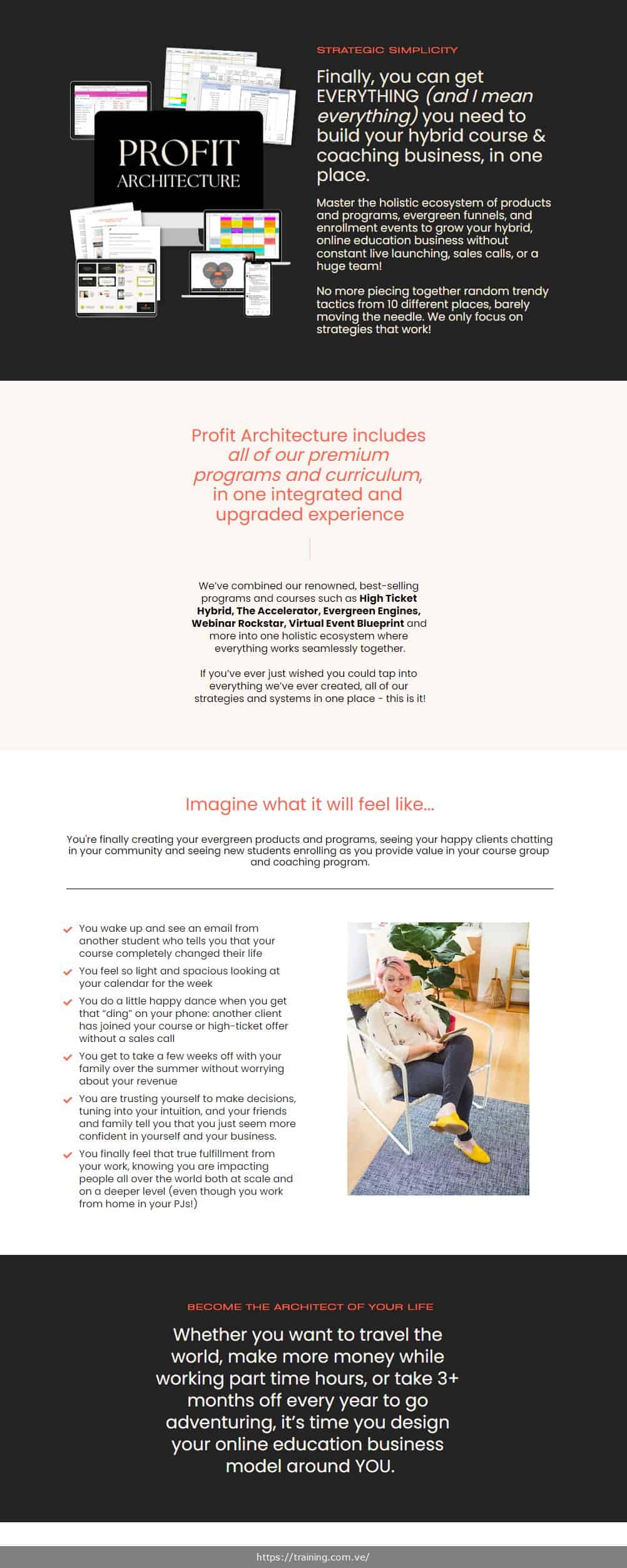 Profit Architecture is your All-Access-Pass to every single strategy, funnel, template, and training you need to build a thriving hybrid evergreen education business fueled by courses, coaching and digital products.