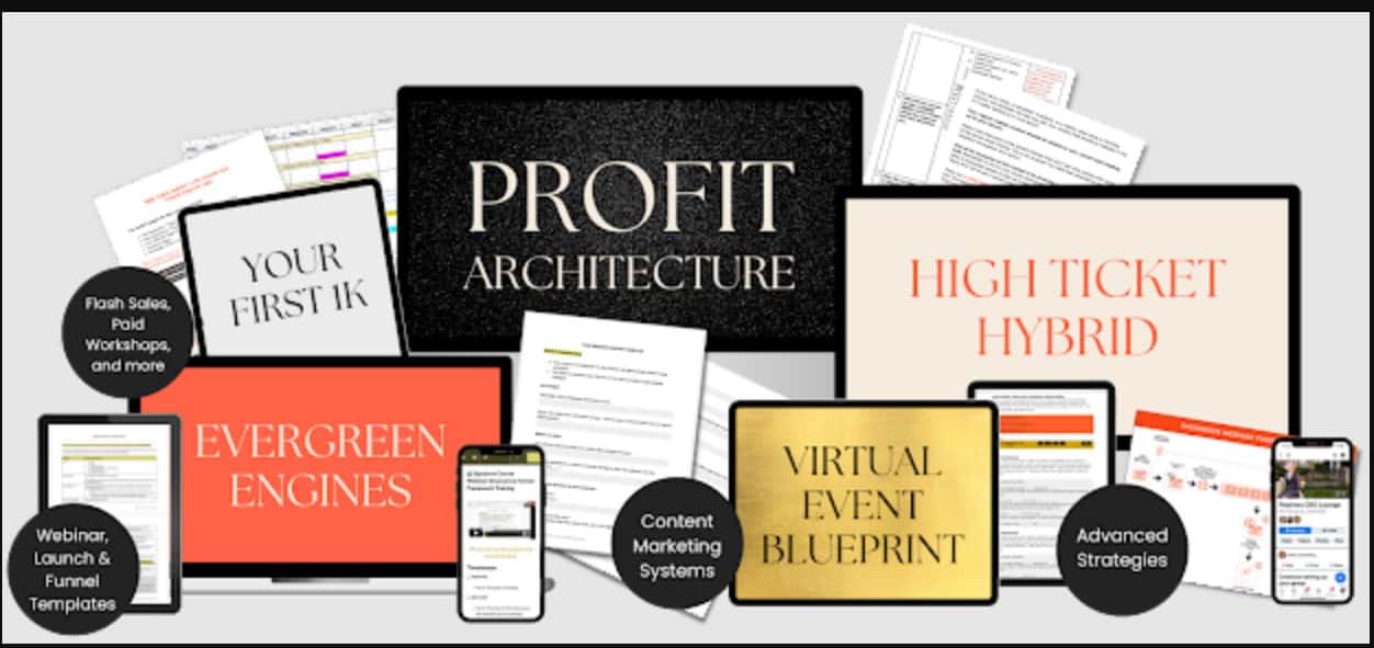 Profit Architecture provides a combination of training and coaching to help individuals create courses or high ticket group coaching programs. The course includes various modules, such as “Launch Your Signature Course” and “Evergreen Engines”, which teach about creating and launching courses, and setting up automated sales funnels for sustained revenue【21†source】【24†source】【25†source】.