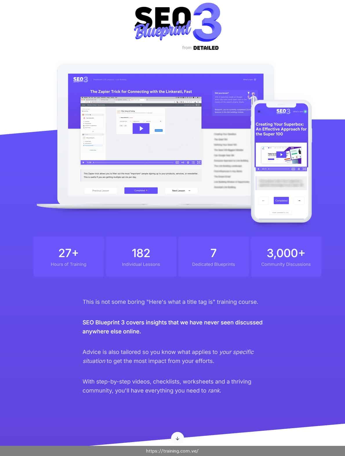 The course has over 27 hours of training and 182 lessons. It's made for SaaS, eCommerce, and local service sites. You'll learn about advanced keyword research and link-building.