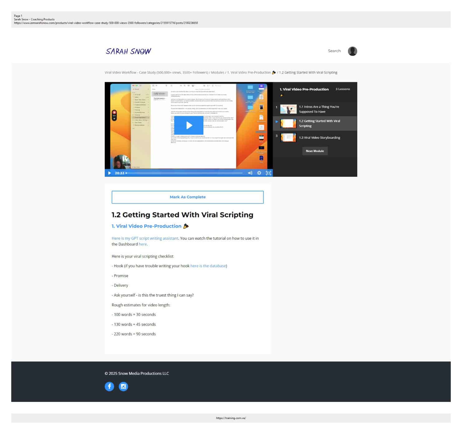 > Note: This includes all recorded training content, video lessons, and downloadable resources from the program. Live coaching sessions, private community membership, and direct access to Sarah Snow are available exclusively through the official Viral Video Academy program.