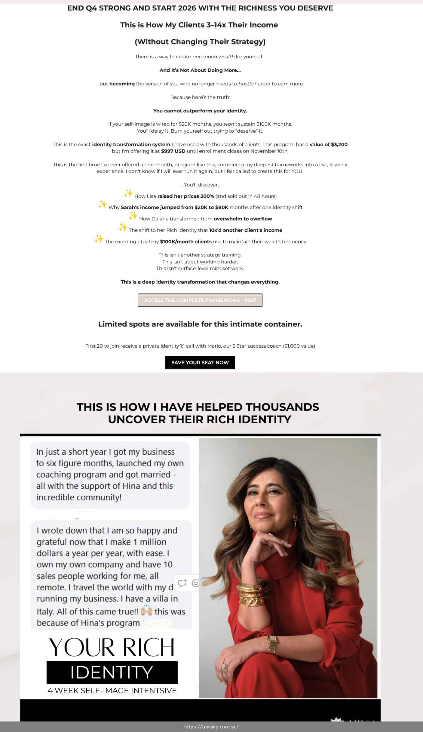 “I feel like I'm performing success rather than actually living it” — The sales page frames this directly: “You're already successful on paper… but you know you're not fully living from the version of you who has it all.” The program's four-week arc moves from dissolving the false performing self (Week 1) to installing and embodying the Rich Identity (Weeks 2–4) through both cognitive and energetic work.