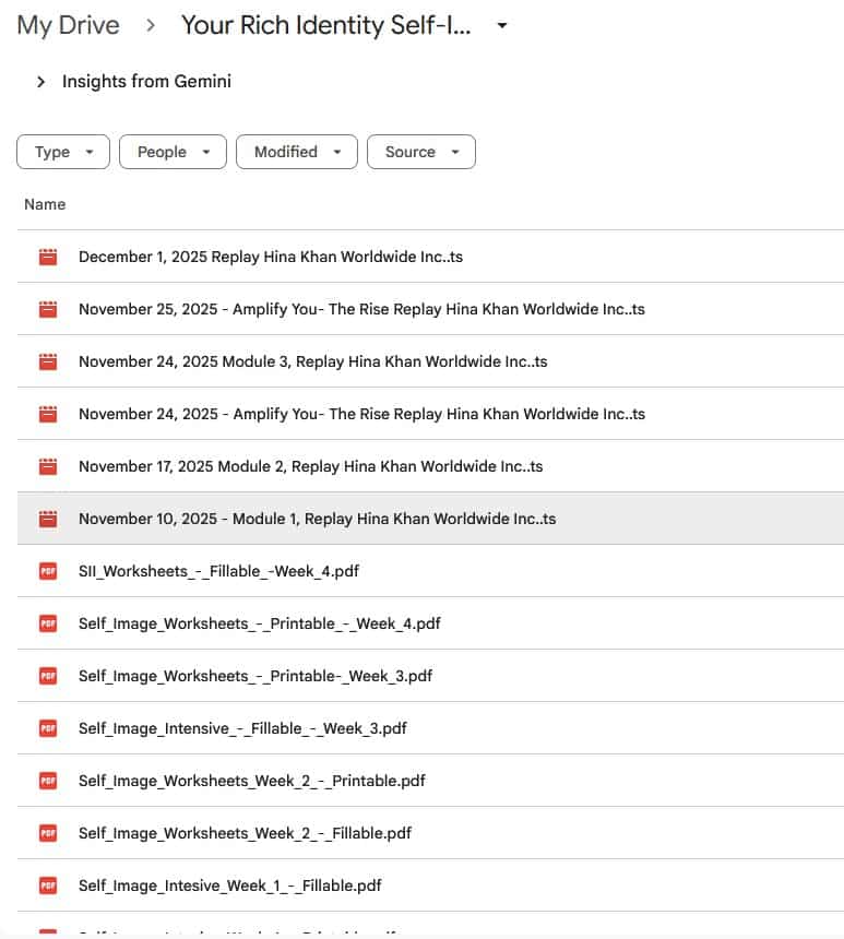 Your Rich Identity Self-Image Intensive by Hina Khan is a 4-week recorded program that addresses the identity and self-image foundations of income growth. The course teaches that income plateaus are caused by a misaligned self-image rather than a lack of strategy, and takes participants through a structured sequence of dissolving limiting beliefs (Week 1), rebuilding a wealth-aligned self-image (Week 2), recalibrating energetic frequency (Week 3), and integrating the new identity with aligned action (Week 4).
